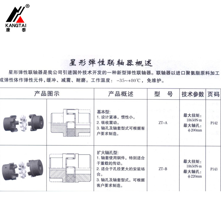星形彈性聯(lián)軸器是我公司引進(jìn)國外技術(shù)開發(fā)的一種新型彈性聯(lián)軸器。聯(lián)軸器以進(jìn)品聚氨脂原料加工成彈性體作彈性元件,緩沖、減震、耐磨。工作溫度:-35- +80度,免維護(hù)。